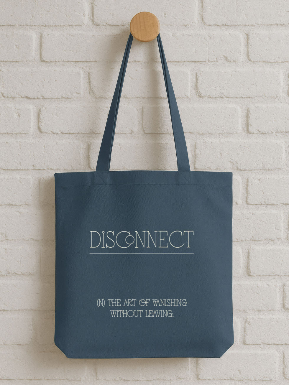 A gentle act of rebellion. The Disconnect tote is a reminder to step back, breathe, and reclaim your space without ever really going anywhere. Made from durable cotton canvas, it’s practical yet poetic, carrying essentials while embodying ease. With its minimalist design and refined typography, this tote makes a quiet statement about the art of vanishing without leaving.