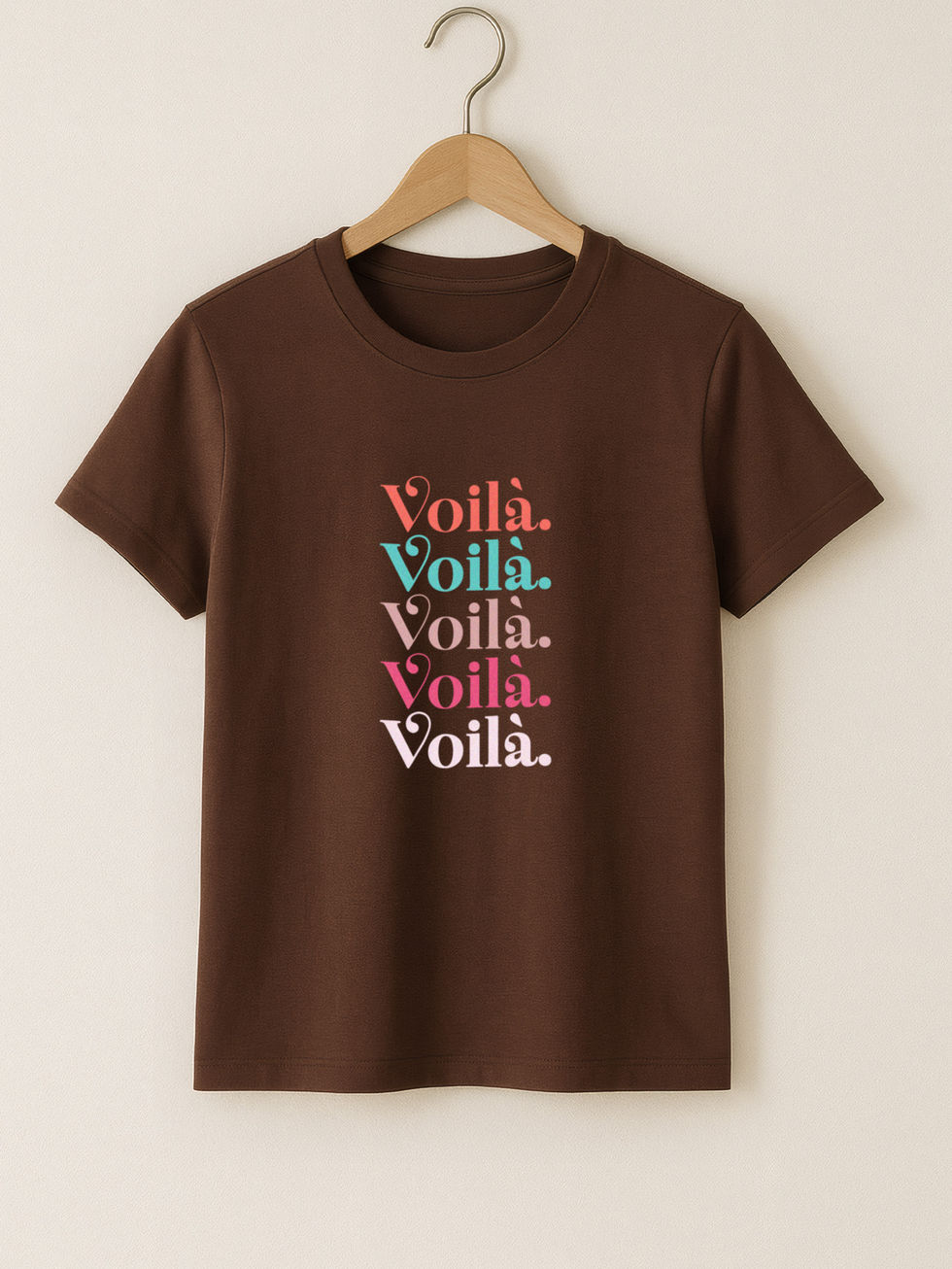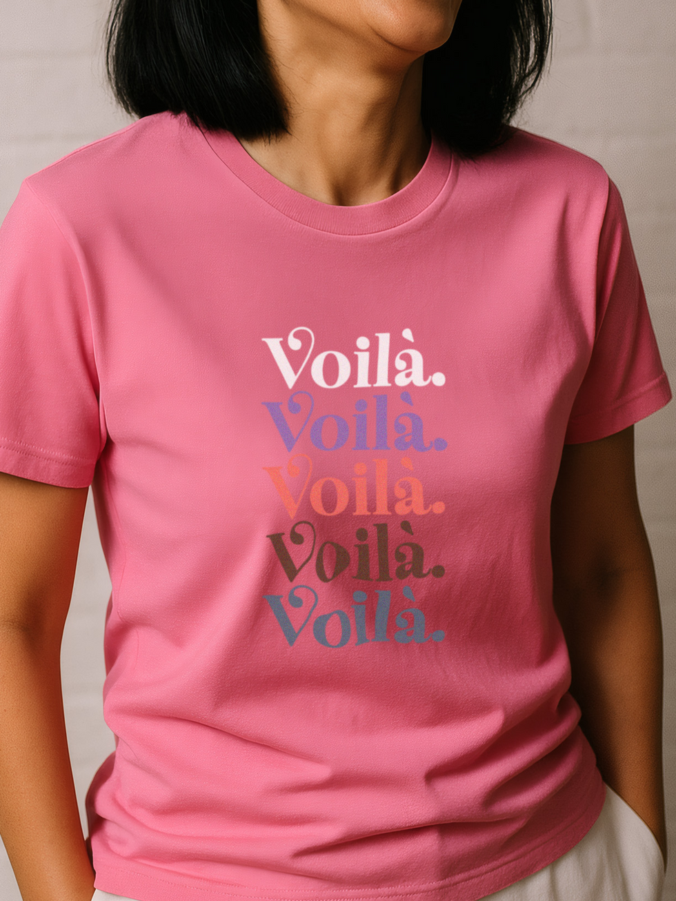 Voilà. Done beautifully. The Voilà tee is a cheeky nod to making things look beautiful with ease. The layered typography creates a subtle statement that feels refined, modern, and quietly bold. Designed for women who make things look effortless.
